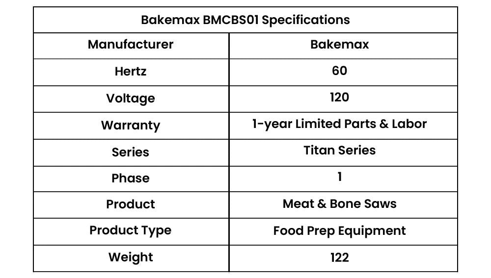 BakeMax BMCBS01 Titan Series Bone Saw is a powerful and reliable countertop appliance designed for precise and efficient cutting of bones and meat. Measuring 34.3 inches in height, 18.9 inches in width, and 18.1 inches in depth, this compact yet robust machine is ideal for both professional kitchens and butcher shops where space and performance are crucial.