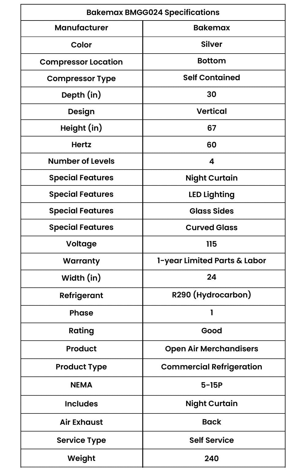 For energy efficiency, the BMGG024 features a night curtain that can be used to cover the display during non-operational hours, reducing power consumption. The ventilated cooling system, combined with an automatic defrost function, ensures reliable performance and minimal maintenance, keeping your products at the optimal temperature. Operating at 220v/60/1-ph, drawing 6.3 amps, and consuming 1340 watts, the BMGG024 is equipped with a NEMA 5-15 plug for easy electrical connectivity. This grab & go refrigerated display case is an excellent addition to any retail environment, offering a perfect blend of functionality, efficiency, and aesthetic appeal.