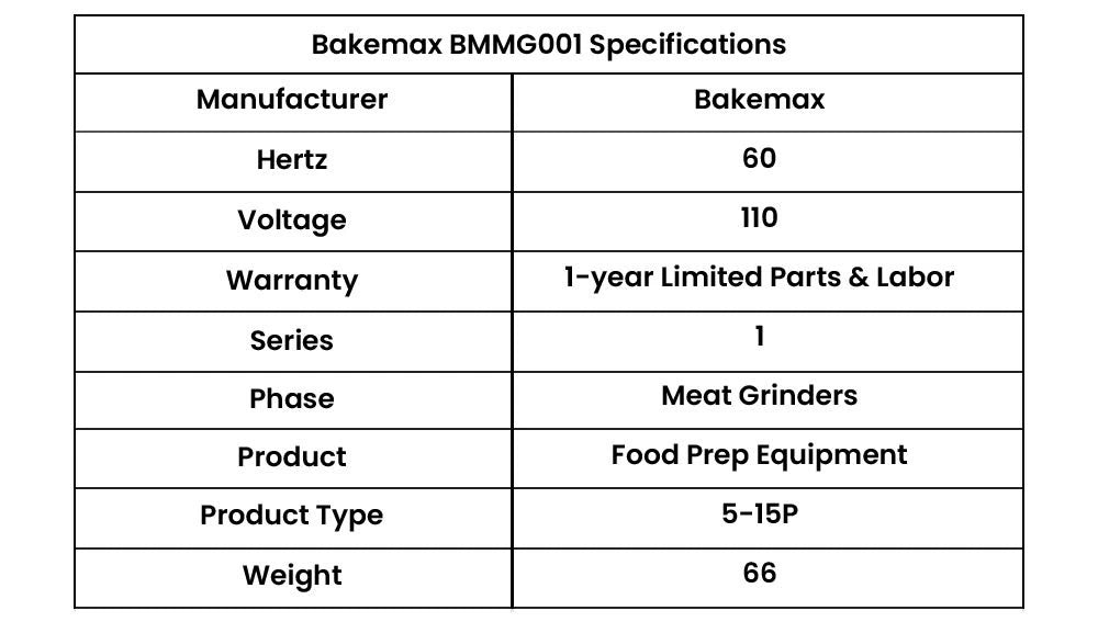 BakeMax (TVI) BMMG001 Meat Grinder is a powerful and efficient countertop appliance designed for high-capacity meat processing. Measuring 16 inches in height, 18 inches in width, and 8 inches in depth, this compact grinder is perfect for both professional and home kitchens where space is at a premium.