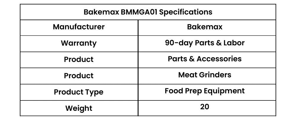 Certified by ETL-Sanitation, the BMMGA01 ensures safe and hygienic food processing, meeting rigorous standards for sanitation and food safety. It is an ideal choice for commercial kitchens seeking reliable and efficient meat grinding solutions that integrate seamlessly with BakeMax mixers. Whether used in restaurants, delis, or other food service establishments, the BakeMax BMMGA01 Meat Grinder attachment offers convenience, versatility, and adherence to safety standards, making it a valuable tool for preparing ground meat and sausage products efficiently.