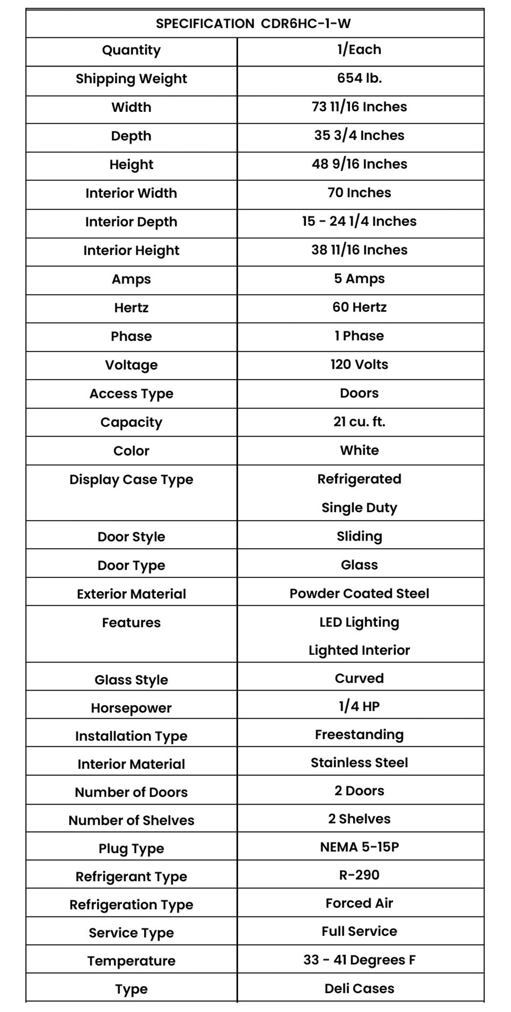 The Beverage-Air CDR6HC-1-W 73" Curved Glass White Refrigerated Bakery/Deli Display Case is designed to enhance product visibility and accessibility while maintaining optimal temperatures for perishable items. Its exterior features a white powder-coated galvanized steel finish that provides durability and an attractive appearance, complementing various retail environments. The interior is crafted from stainless steel, offering a clean and professional look, while the mirrored end caps enhance the visual appeal by reflecting the displayed products. The curved front glass allows for an unobstructed view of the contents, making it easier for customers to engage with the displayed bakery or deli items. The sliding glass doors are removable, facilitating easy access for restocking and cleaning. Equipped with full electronic control, the display case allows for precise temperature settings, accommodating various food types and ensuring they remain fresh. It is illuminated by LED lighting, which can be easily turned on and off, providing optimal visibility of the products while being energy-efficient. An electrical outlet for scales is included, making it convenient for weighing items directly in front of customers. Adjustable shelves provide flexibility for better product display, allowing for the arrangement of items in a way that maximizes space and visibility. The price tag molding standard on the unit ensures that pricing information is readily available to customers. Additionally, this display case is rated for open food, making it suitable for a wide range of applications in bakeries and delis. Weight & Dimensions Width Overall: 73 11/16 inches Depth Overall: 35 47/64 inches Height Overall: 48 9/16 inches Weight: 672 lbs