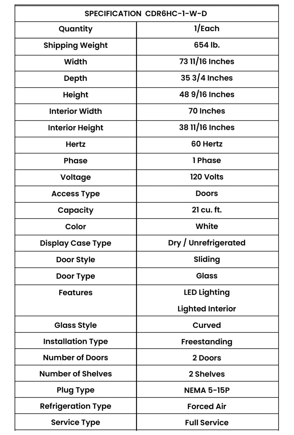 The Beverage-Air CDR6HC-1-W-D Curved Glass Bakery Display Case offers an elegant design with a white powder-coated galvanized steel exterior and a stainless steel interior. It features mirrored end caps, giving it a classical appearance while enhancing product visibility. The curved front glass and sliding, removable glass doors make accessing and showcasing baked goods simple. For optimal display, the unit includes adjustable shelves and comes standard with price tag molding. Additionally, it is equipped with LED lighting, controlled by an on/off switch, and an electrical outlet for scale usage. Its open food rating ensures safety for displaying unpackaged items. With overall dimensions of 73 11/16β in width, 35 47/64β in depth, and 48 9/16β in height, this display case is perfect for showcasing baked goods in style. Weight & Dimensions Width: 73 11/16 inches Depth: 35 47/64 inches (with handle) Height: 48 9/16 inches Weight 672 lbs