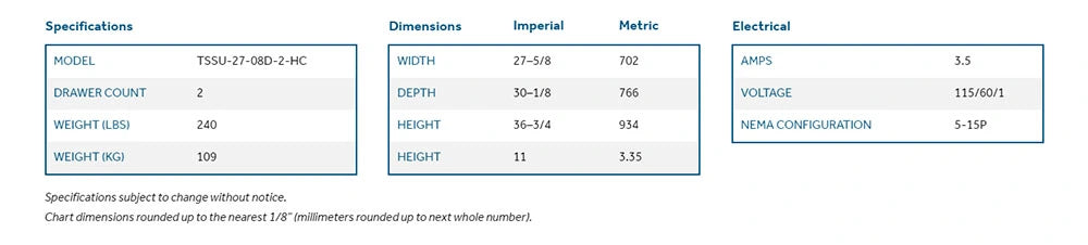 The True TSSU-27-08D-2-HC is a compact yet efficient sandwich and salad prep table designed for smaller commercial kitchens. With a 27" width, this unit is ideal for operations with limited space but still requiring a functional prep area. It features a durable cutting board that provides ample surface area for food preparation. Above the prep area, the refrigerated base includes pan rails that can hold up to 8 pans, ensuring that ingredients are kept chilled and accessible during busy service times. The design allows for organized storage, making ingredient retrieval quick and efficient. Constructed with a stainless steel exterior, the TSSU-27-08D-2-HC combines durability with an easy-to-maintain surface, making it suitable for high-use environments. The unit operates on a 115v/1ph power supply, which is compatible with standard commercial electrical systems. Its advanced refrigeration system maintains temperatures between 33Β°F and 41Β°F, ensuring that all stored ingredients remain fresh and safe. With its compact size and practical features, this prep table is an excellent choice for small to mid-sized foodservice operations, such as delis and cafΓ©s, where space and efficiency are key.We strive toΒ deliver ordersΒ toΒ yourΒ doorstepΒ using a fast and affordable shipping method. The Turnaround time and cost can be calculatedΒ on our website.Β However, the actual shipping charges may vary. If the difference isΒ more than 15%, we will contact you via phone or emailΒ andΒ obtain your consent before finalizing the purchase.
