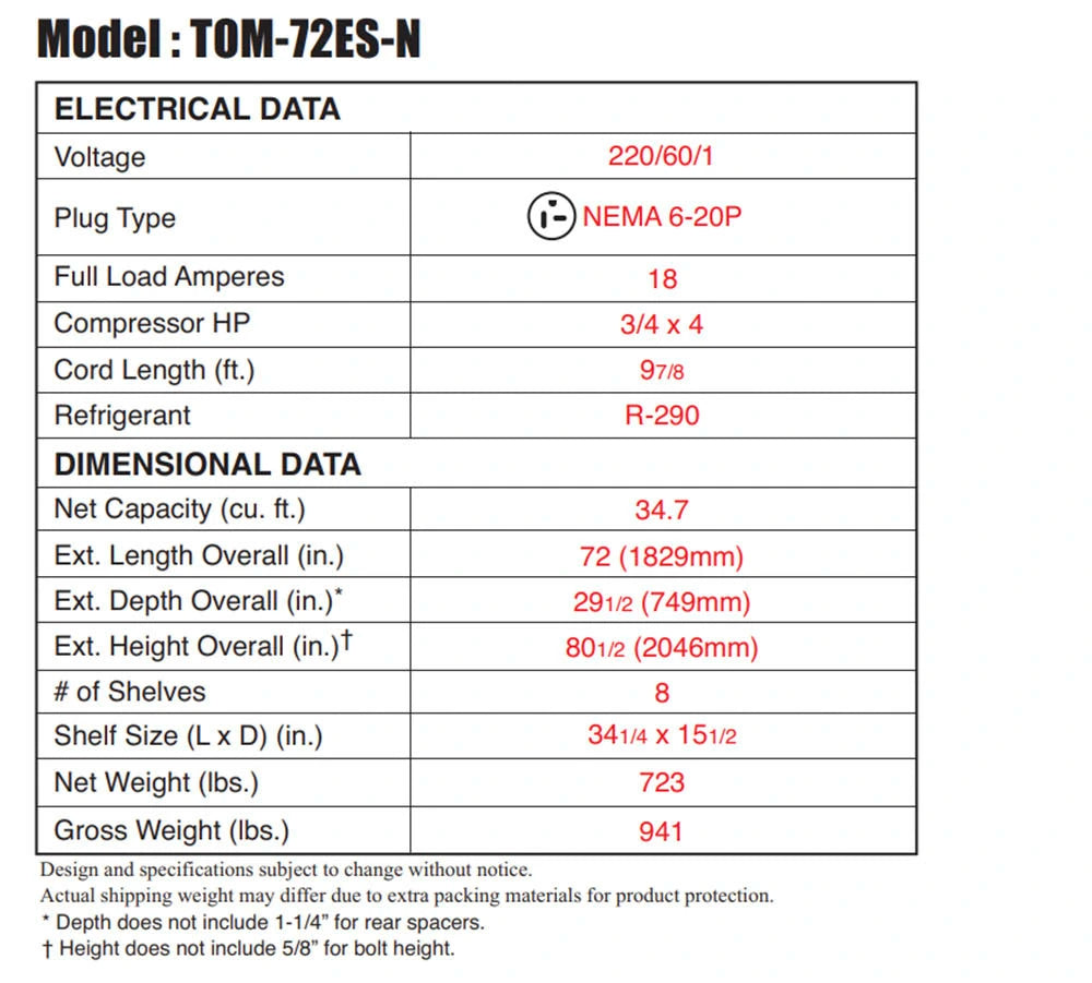 Open display merchandiser, Vertical air curtain, 72" length, Stainless steel exterior and interior, Self-Cleaning Condenser equipped, Hydrocarbon refrigerants (R-290), LED interior lighting under each shelf, Energy saving night curtain standard, Standard back-guard improves airflow, High-density cell insulation (CFC free), Perforated interior back wall and top for improved airflow, Front air intake and rear air discharge, 220V/60/1, NEMA 6-20P, 18 Amp, 3/4 x 4 HP, 34.7 cu. ft., cETLus, ETL-Sanitation Warranty 2 Year Parts & Labor Additional 3 Year CompressorΒ