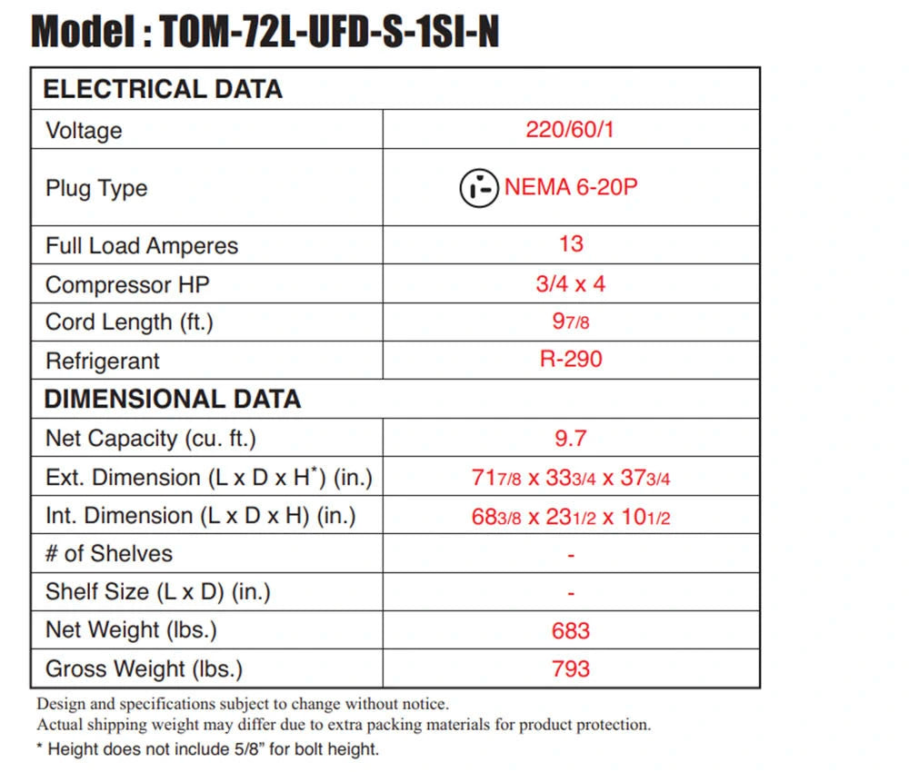 Drop-In Horizontal Open Display Case, low profile, 9.7 cu. ft. capacity, 71-7/8"W x 33-3/4"D x 37-3/4"H, self-contained refrigeration with self-cleaning condenser, deck only, tempered glass front shield & side walls, rear sliding glass doors, solar digital thermometer, digital electronic thermostat with defrost control, LED interior lighting, stainless steel interior & exterior, front air intake & rear air discharge, includes night cover, R290 Hydrocarbon refrigerant, (4) 3/4 HP, 220v/60/1-ph, 13.0 amps, cord with NEMA 6-20P, cETLus, ETL-Sanitation (Contact sales for lead time) Warranty 2 Year Parts & Labor Additional 3 Year CompressorΒ